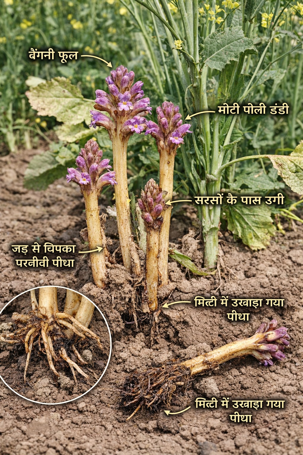 भारत की सरसों (Mustard) की फसल, जो देश की सबसे बड़ी स्वदेशी खाद्य तेल स्रोत है, आज एक गंभीर “छिपे हुए खतरे” (Hidden Threat) का सामना कर रही है। यह खतरा है ओरोबैंकी एजिप्टियाका (Orobanche aegyptiaca) नामक परजीवी खरपतवार (Parasitic Weed), जो सरसों की जड़ों से चिपककर पौधे से पोषक तत्व, पानी और कार्बन (Nutrients, Water and Carbon) चूस लेती है। इसके कारण पौधे पीले पड़ जाते हैं, उनकी वृद्धि रुक जाती है और बीज उत्पादन (Seed Yield) घट जाता है।