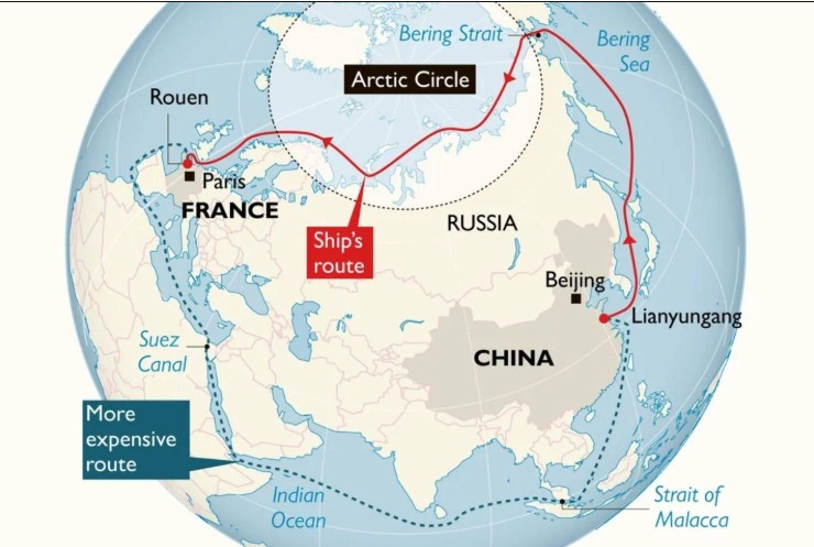 जलवायु परिवर्तन के कारण आर्कटिक समुद्री बर्फ के पिघलने से नए व्यापारिक मार्ग खुल रहे हैं, जिनमें नॉर्दर्न सी रूट (Northern Sea Route – NSR) प्रमुख है। यह मार्ग रूस के उत्तरी तट के साथ चलता है और एशिया को यूरोप से जोड़ता है। वर्ष 2024 में एक चीनी जहाज़ ने इसी मार्ग से लगभग 20 दिनों में ब्रिटेन तक यात्रा की। पोलर सिल्क रोड के तहत चीन ने आइसलैंड और नॉर्वे में वैज्ञानिक अनुसंधान केंद्र स्थापित किए हैं तथा आइसब्रेकर जहाज़ों और उपग्रह प्रणालियों के माध्यम से आर्कटिक अध्ययन को बढ़ावा दिया है। यद्यपि चीन आर्कटिक में अपनी मौजूदगी बढ़ा रहा है, उसकी भूमिका फिलहाल सीमित मानी जाती है और वह काफी हद तक रूस के सहयोग पर निर्भर है।
